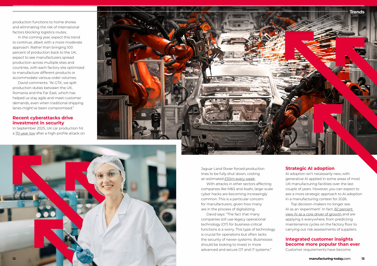 AI adoption isn’ t necessarily new, with generative AI applied in some areas of most UK manufacturing facilities over the last couple of years. However, you can expect to see a more strategic approach to AI adoption in a manufacturing context for 2026.