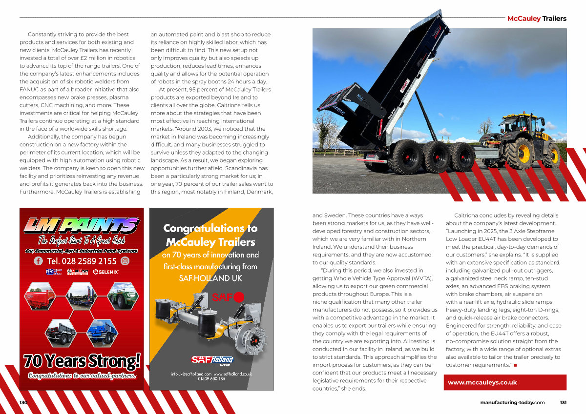 At present, 95 percent of McCauley Trailers products are exported beyond Ireland to clients all over the globe. Caitriona tells us more about the strategies that have been most effective in reaching international markets.“ Around 2003, we noticed that the market in Ireland was becoming increasingly difficult, and many businesses struggled to survive unless they adapted to the changing landscape. As a result, we began exploring opportunities further afield. Scandinavia has been a particularly strong market for us; in one year, 70 percent of our trailer sales went to this region, most notably in Finland, Denmark, 130