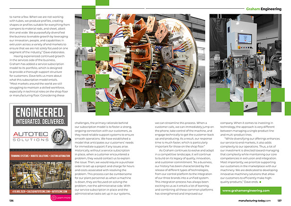 “ While diversifying our offerings enhances our service to end markets, it also adds complexity to our operations. Thus, a lot of our investment is directed toward managing that complexity while maintaining our core competencies in extrusion and integration. Most importantly, we prioritize supporting our customers in the marketplace with our machinery. We are dedicated to developing innovative machinery solutions that allow our customers to efficiently make highquality products,” Dave ends. ■