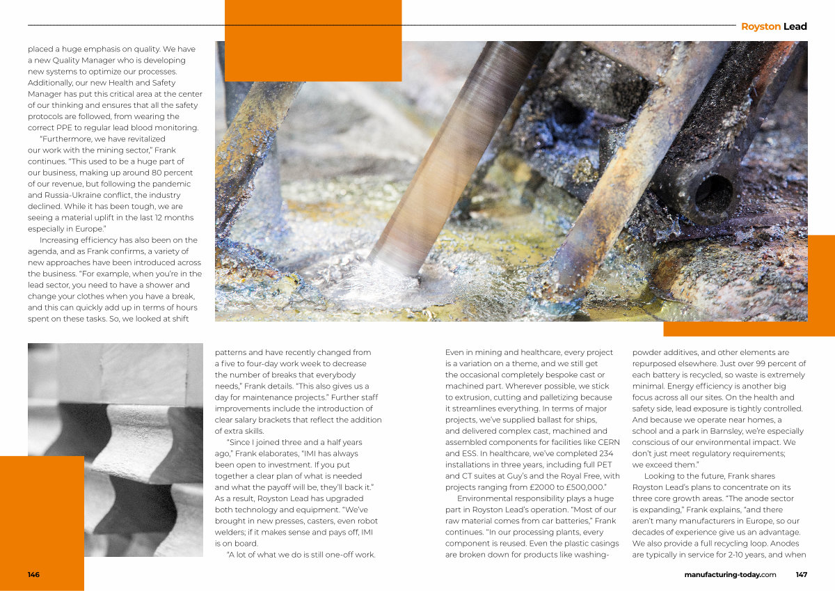 “ Since I joined three and a half years ago,” Frank elaborates,“ IMI has always been open to investment. If you put together a clear plan of what is needed and what the payoff will be, they’ ll back it.” As a result, Royston Lead has upgraded both technology and equipment.“ We’ ve brought in new presses, casters, even robot welders; if it makes sense and pays off, IMI is on board.