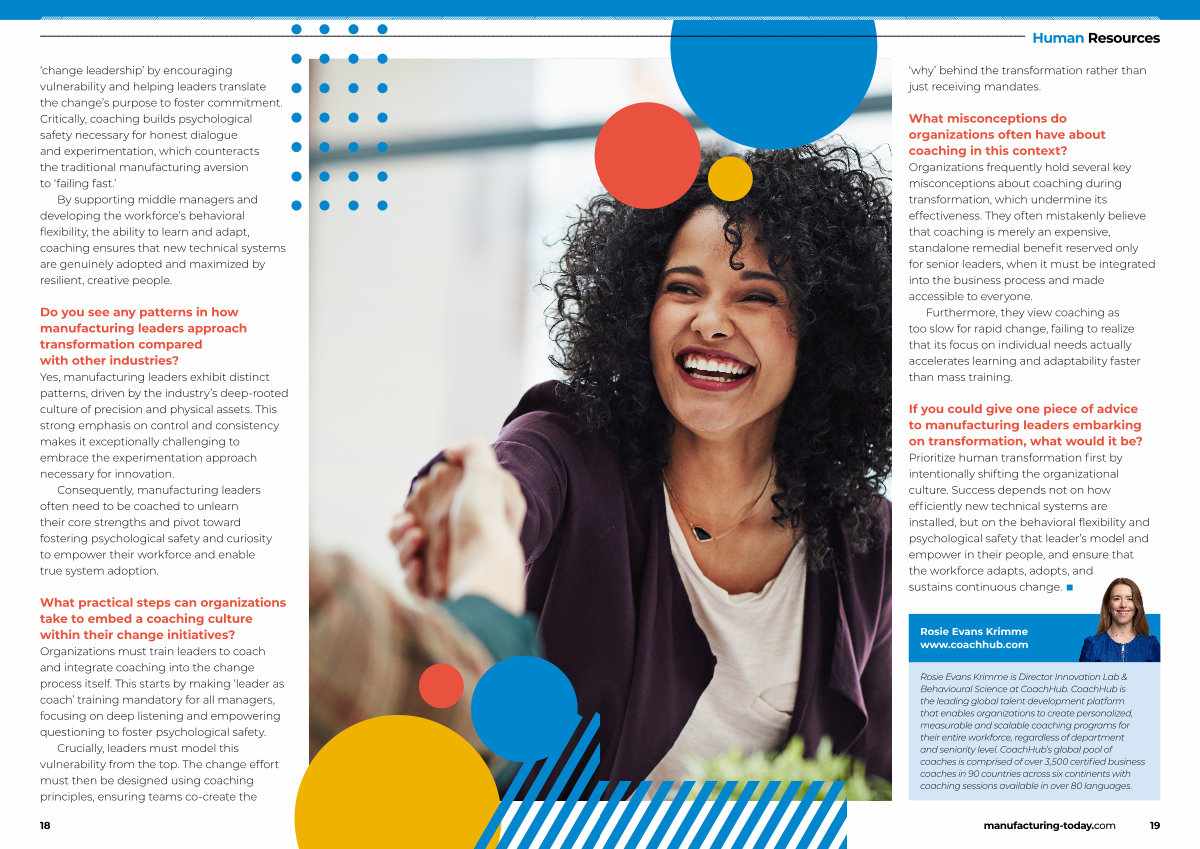 If you could give one piece of advice to manufacturing leaders embarking on transformation, what would it be? Prioritize human transformation first by intentionally shifting the organizational culture. Success depends not on how efficiently new technical systems are installed, but on the behavioral flexibility and psychological safety that leader’ s model and empower in their people, and ensure that the workforce adapts, adopts, and sustains continuous change. ■
