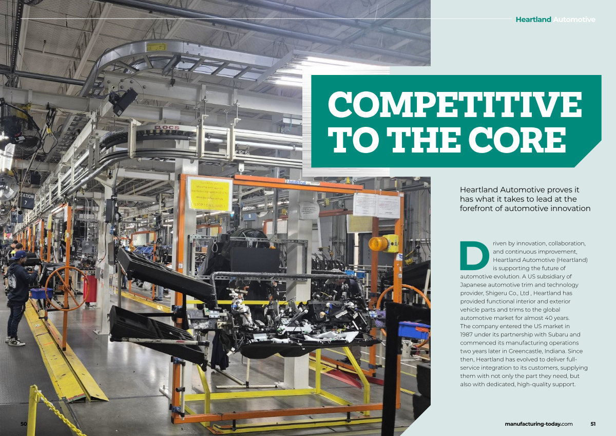 Driven by innovation, collaboration, and continuous improvement, Heartland Automotive( Heartland) is supporting the future of automotive evolution. A US subsidiary of Japanese automotive trim and technology provider, Shigeru Co., Ltd, Heartland has provided functional interior and exterior vehicle parts and trims to the global automotive market for almost 40 years. The company entered the US market in 1987 under its partnership with Subaru and commenced its manufacturing operations two years later in Greencastle, Indiana. Since then, Heartland has evolved to deliver fullservice integration to its customers, supplying them with not only the part they need, but also with dedicated, high-quality support.