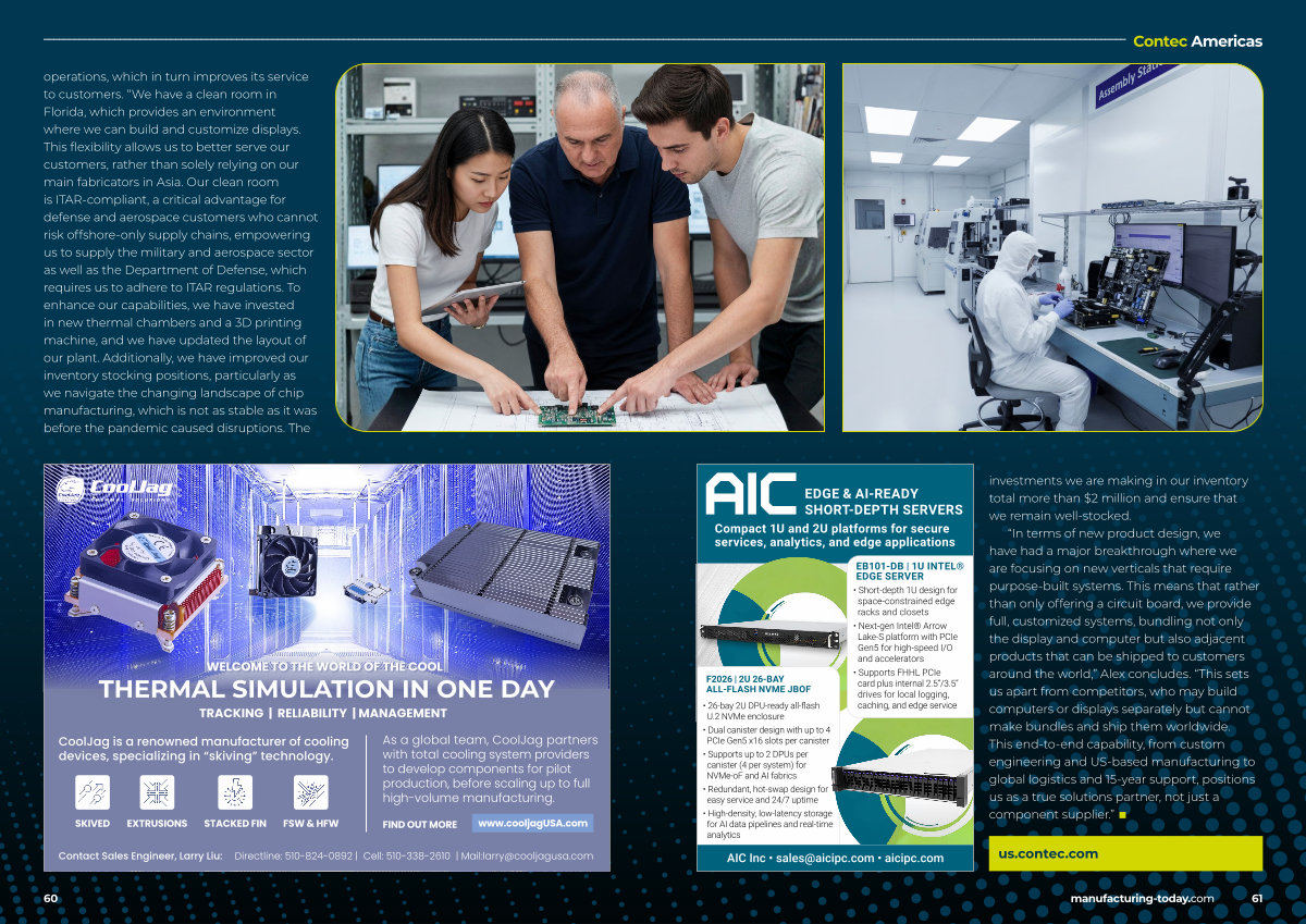 operations, which in turn improves its service to customers.“ We have a clean room in Florida, which provides an environment where we can build and customize displays. This flexibility allows us to better serve our customers, rather than solely relying on our main fabricators in Asia. Our clean room is ITAR-compliant, a critical advantage for defense and aerospace customers who cannot risk offshore-only supply chains, empowering us to supply the military and aerospace sector as well as the Department of Defense, which requires us to adhere to ITAR regulations. To enhance our capabilities, we have invested in new thermal chambers and a 3D printing machine, and we have updated the layout of our plant. Additionally, we have improved our inventory stocking positions, particularly as we navigate the changing landscape of chip manufacturing, which is not as stable as it was before the pandemic caused disruptions. The