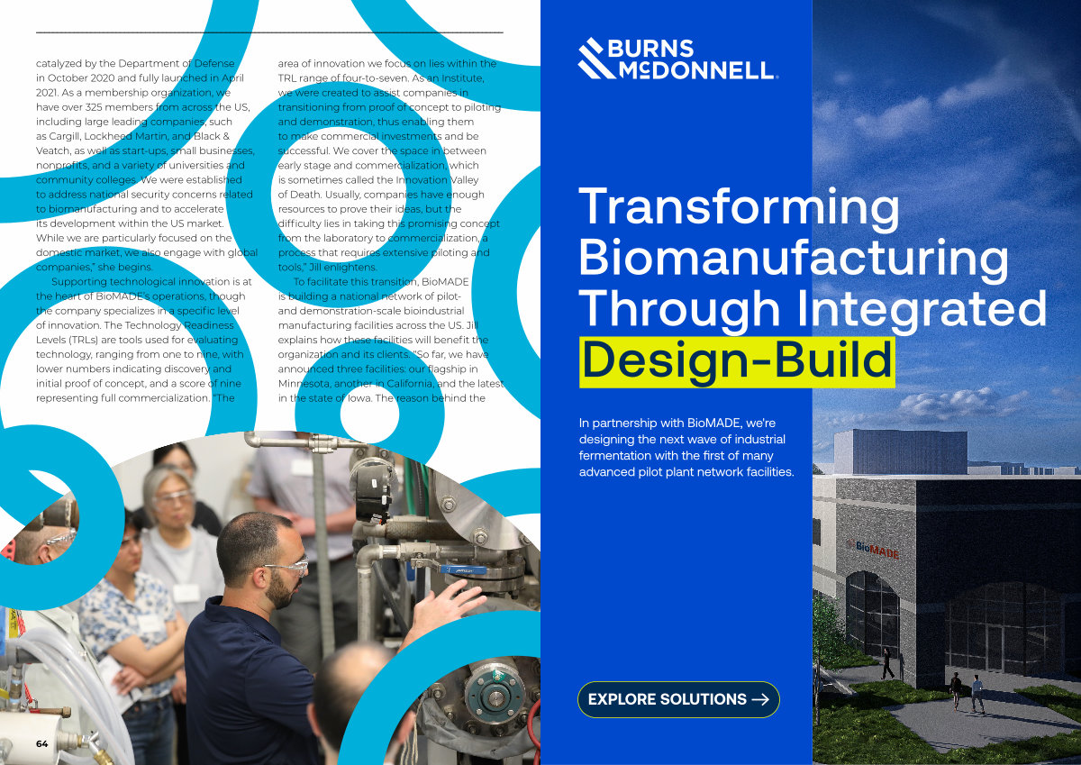 To facilitate this transition, BioMADE is building a national network of pilotand demonstration-scale bioindustrial manufacturing facilities across the US. Jill explains how these facilities will benefit the organization and its clients.“ So far, we have announced three facilities: our flagship in Minnesota, another in California, and the latest in the state of Iowa. The reason behind the