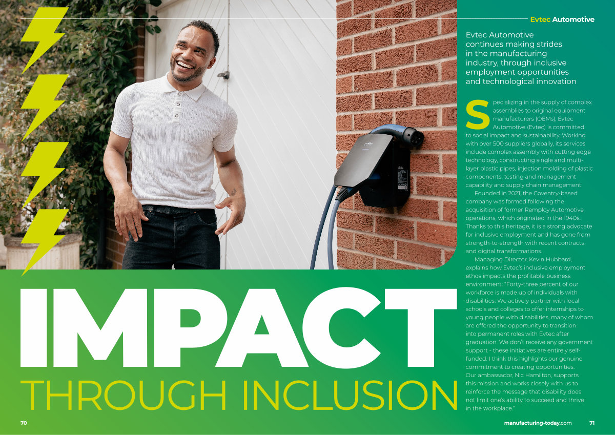Managing Director, Kevin Hubbard, explains how Evtec’ s inclusive employment ethos impacts the profitable business environment:“ Forty-three percent of our workforce is made up of individuals with disabilities. We actively partner with local schools and colleges to offer internships to young people with disabilities, many of whom are offered the opportunity to transition into permanent roles with Evtec after graduation. We don’ t receive any government support- these initiatives are entirely selffunded. I think this highlights our genuine commitment to creating opportunities. Our ambassador, Nic Hamilton, supports this mission and works closely with us to reinforce the message that disability does not limit one’ s ability to succeed and thrive in the workplace.”