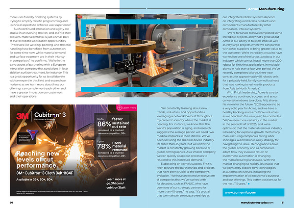 more user-friendly finishing systems by trying to simplify robotic programming and technical aspects to enhance user experience.” Such continued innovation and agility are crucial in an evolving market, and as Fritz then explains, material removal is just a small part of overall robotic application opportunities.“ Processes like welding, painting, and material handling have benefited from automation for some time now, while material removal and surface treatment are in their infancy in comparison,” he confirms.“ We’ re in the early stages of partnering with a European integration company that specializes in laser ablation surface treatment, for instance. This is a great opportunity for us to collaborate with an expert in this field and expand our horizons as we learn more about how our offerings can complement each other and have a greater impact on our customers and their operations.
