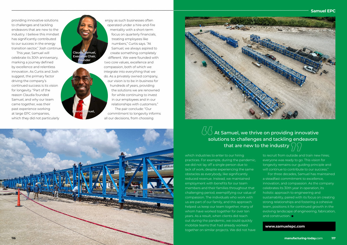 For three decades, Samuel has maintained a steadfast commitment to excellence, innovation, and compassion. As the company celebrates its 30th year in operation, its holistic approach to engineering and sustainability, paired with its focus on creating strong relationships and fostering a cohesive team, positions it for continued growth in the evolving landscape of engineering, fabrication, and construction. ■