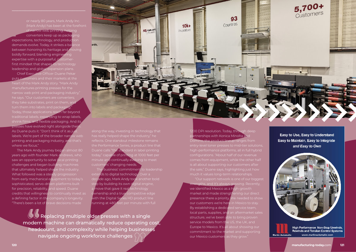 “ Our support network is one of our biggest strengths, and it’ s always growing. Recently, we identified Mexico as a high-growth market and made strengthening our direct presence there a priority. We needed to show our customers we’ re here in Mexico to stay. By establishing a dedicated service team, local parts, supplies, and an aftermarket sales structure, we’ ve been able to bring proven service models from the US, the UK, and Europe to Mexico. It’ s all about showing our commitment to the market and supporting our Mexico customers as they grow.” manufacturing-today. com 121
