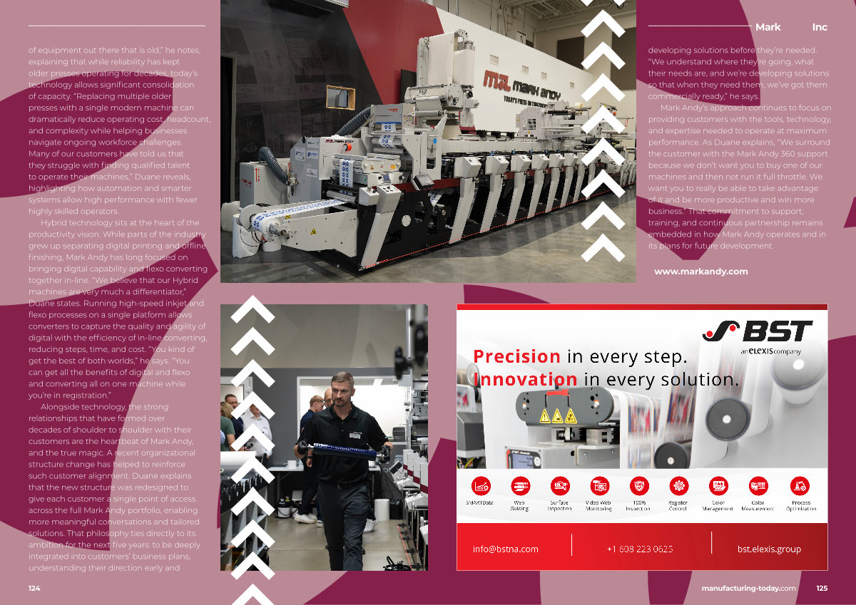 Mark Andy’ s approach continues to focus on providing customers with the tools, technology, and expertise needed to operate at maximum performance. As Duane explains,“ We surround the customer with the Mark Andy 360 support because we don’ t want you to buy one of our machines and then not run it full throttle. We want you to really be able to take advantage of it and be more productive and win more business.” That commitment to support, training, and continuous partnership remains embedded in how Mark Andy operates and in its plans for future development. ■