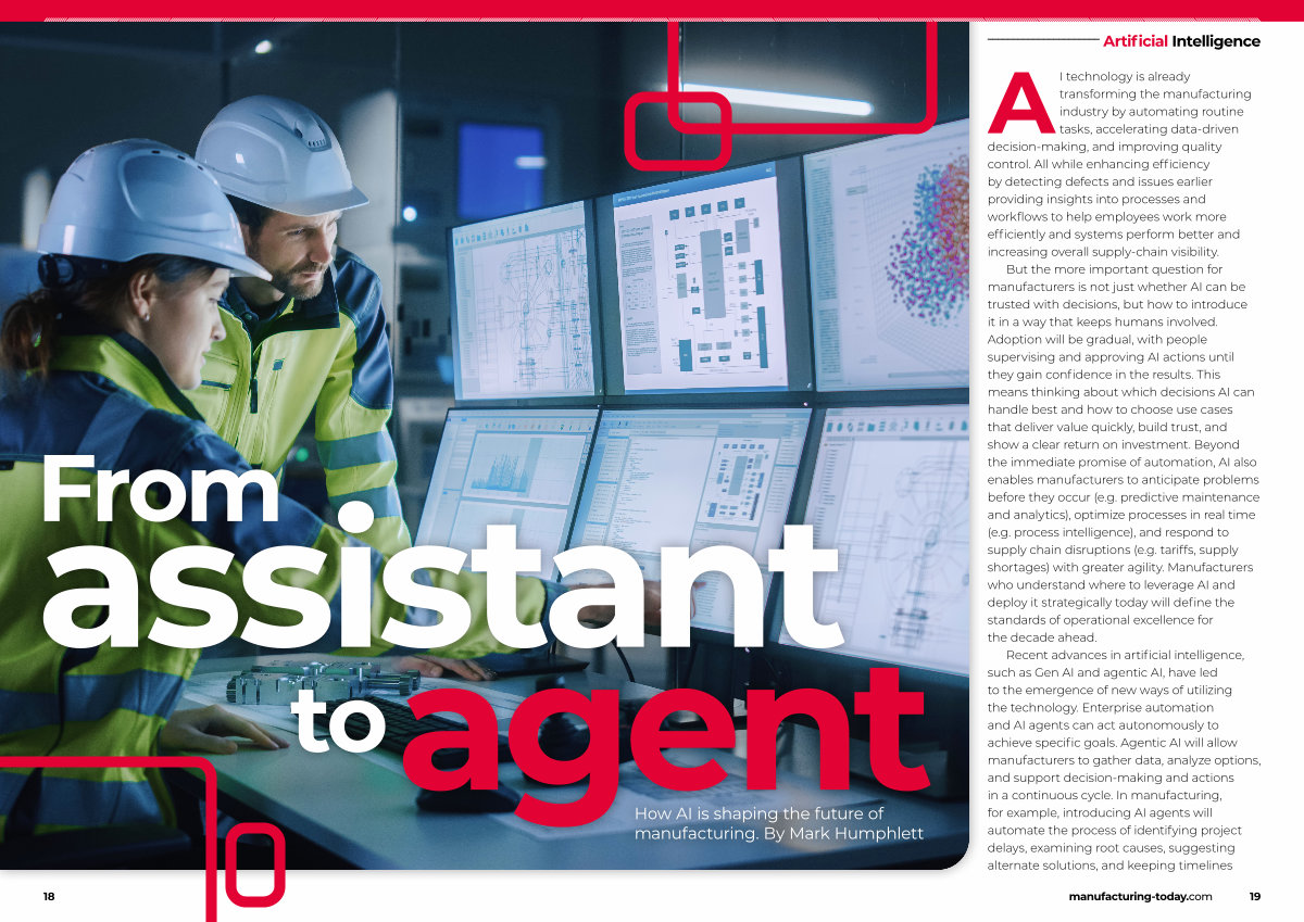 Recent advances in artificial intelligence, such as Gen AI and agentic AI, have led to the emergence of new ways of utilizing the technology. Enterprise automation and AI agents can act autonomously to achieve specific goals. Agentic AI will allow manufacturers to gather data, analyze options, and support decision-making and actions in a continuous cycle. In manufacturing, for example, introducing AI agents will automate the process of identifying project delays, examining root causes, suggesting alternate solutions, and keeping timelines