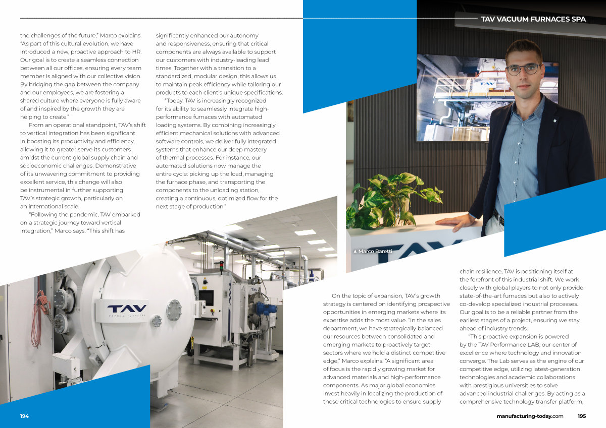 On the topic of expansion, TAV’ s growth strategy is centered on identifying prospective opportunities in emerging markets where its expertise adds the most value.“ In the sales department, we have strategically balanced our resources between consolidated and emerging markets to proactively target sectors where we hold a distinct competitive edge,” Marco explains.“ A significant area of focus is the rapidly growing market for advanced materials and high-performance components. As major global economies invest heavily in localizing the production of these critical technologies to ensure supply chain resilience, TAV is positioning itself at the forefront of this industrial shift. We work closely with global players to not only provide state-of-the-art furnaces but also to actively co-develop specialized industrial processes. Our goal is to be a reliable partner from the earliest stages of a project, ensuring we stay ahead of industry trends.