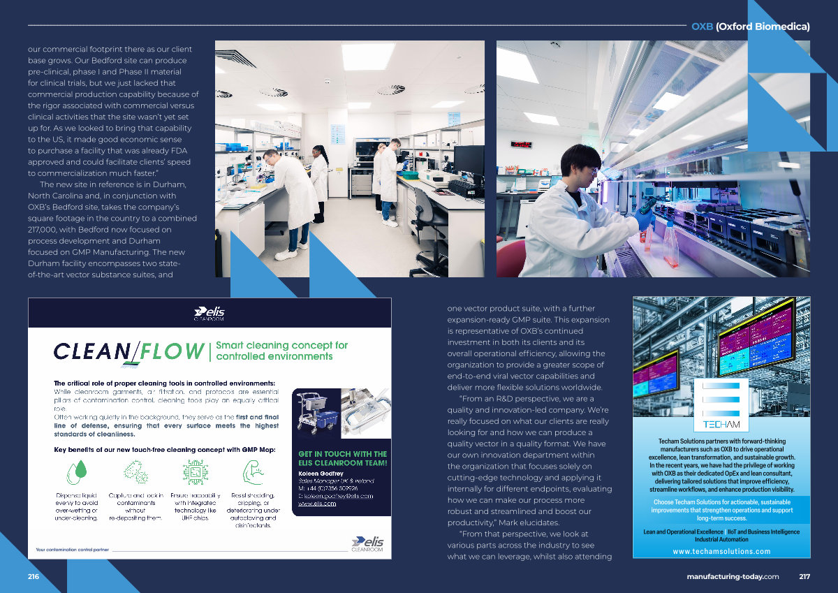 The new site in reference is in Durham, North Carolina and, in conjunction with OXB’ s Bedford site, takes the company’ s square footage in the country to a combined 217,000, with Bedford now focused on process development and Durham focused on GMP Manufacturing. The new Durham facility encompasses two stateof-the-art vector substance suites, and