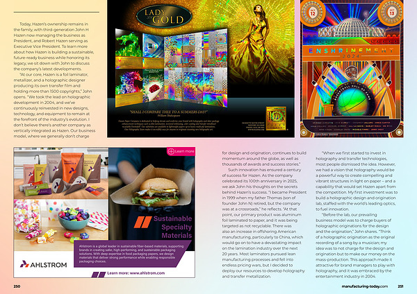 “ At our core, Hazen is a foil laminator, metallizer, and a holographic designer producing its own transfer film and holding more than 1500 copyrights,” John opens.“ We took the lead on holographic development in 2004, and we’ ve continuously reinvested in new designs, technology, and equipment to remain at the forefront of the industry’ s evolution. I don’ t believe there’ s another company as vertically integrated as Hazen. Our business model, where we generally don’ t charge