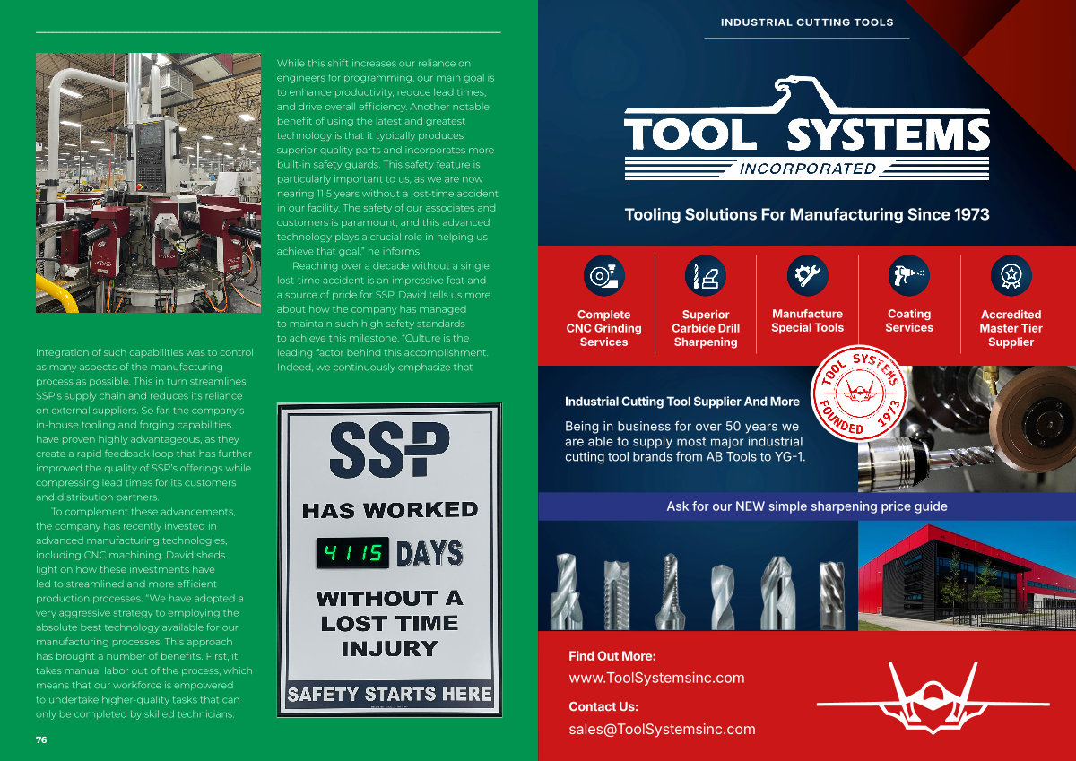integration of such capabilities was to control as many aspects of the manufacturing process as possible. This in turn streamlines SSP’ s supply chain and reduces its reliance on external suppliers. So far, the company’ s in-house tooling and forging capabilities have proven highly advantageous, as they create a rapid feedback loop that has further improved the quality of SSP’ s offerings while compressing lead times for its customers and distribution partners.