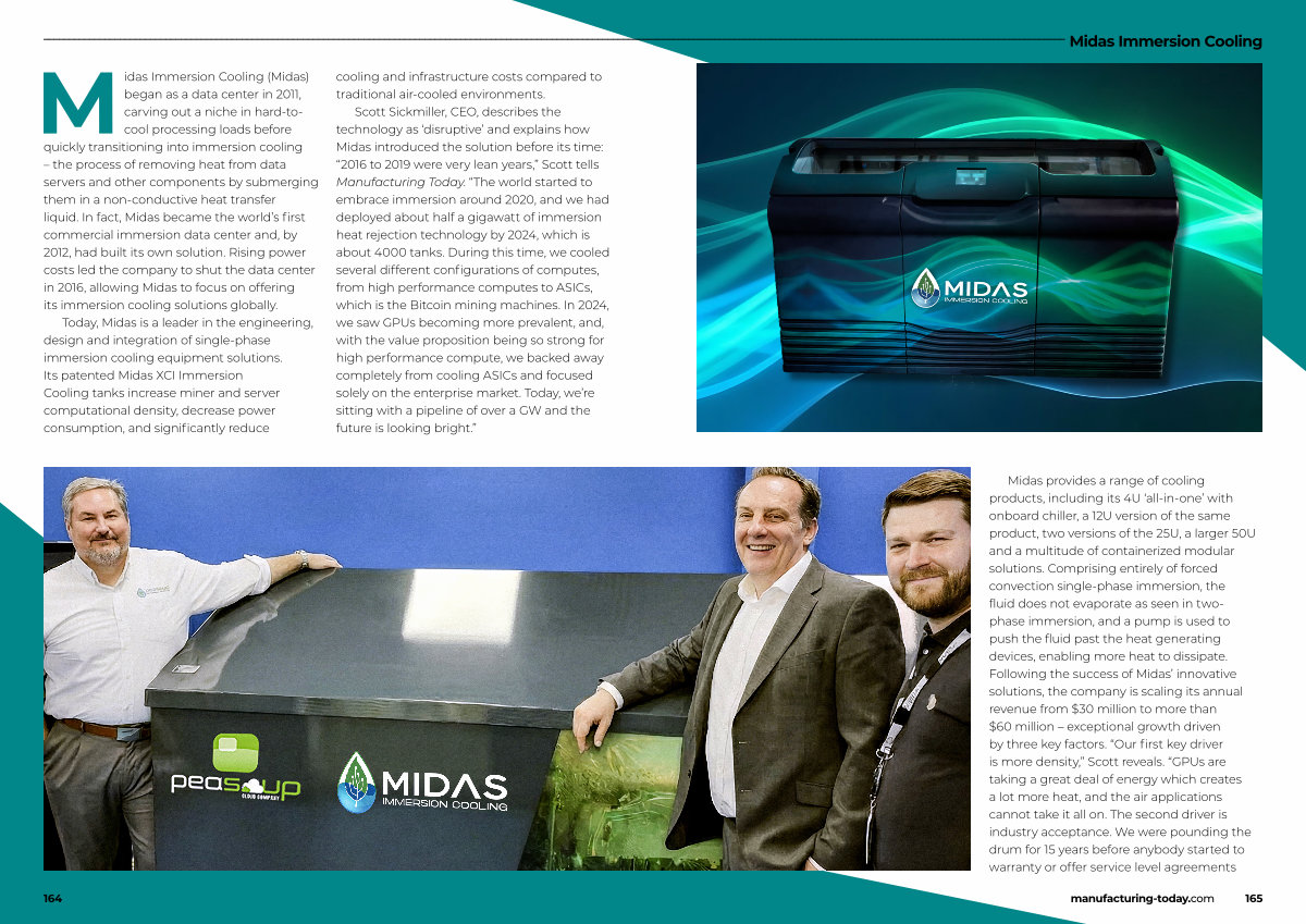 Scott Sickmiller, CEO, describes the technology as‘ disruptive’ and explains how Midas introduced the solution before its time:“ 2016 to 2019 were very lean years,” Scott tells Manufacturing Today.“ The world started to embrace immersion around 2020, and we had deployed about half a gigawatt of immersion heat rejection technology by 2024, which is about 4000 tanks. During this time, we cooled several different configurations of computes, from high performance computes to ASICs, which is the Bitcoin mining machines. In 2024, we saw GPUs becoming more prevalent, and, with the value proposition being so strong for high performance compute, we backed away completely from cooling ASICs and focused solely on the enterprise market. Today, we’ re sitting with a pipeline of over a GW and the future is looking bright.”