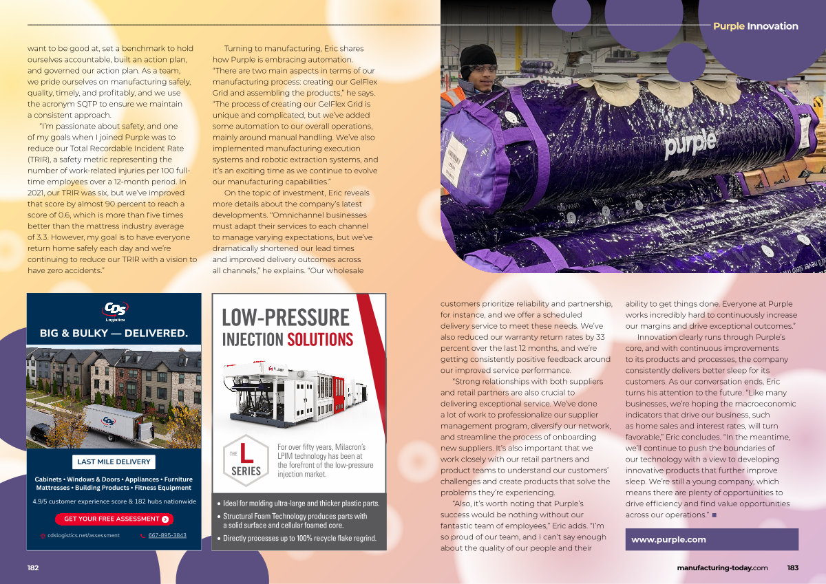 “ I’ m passionate about safety, and one of my goals when I joined Purple was to reduce our Total Recordable Incident Rate( TRIR), a safety metric representing the number of work-related injuries per 100 fulltime employees over a 12-month period. In 2021, our TRIR was six, but we’ ve improved that score by almost 90 percent to reach a score of 0.6, which is more than five times better than the mattress industry average of 3.3. However, my goal is to have everyone return home safely each day and we’ re continuing to reduce our TRIR with a vision to have zero accidents.”