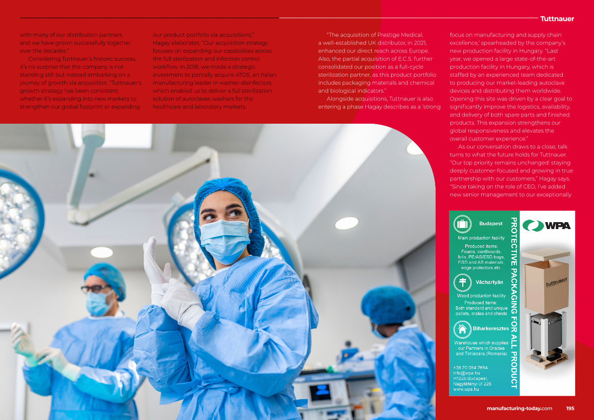 Alongside acquisitions, Tuttnauer is also entering a phase Hagay describes as a‘ strong focus on manufacturing and supply chain excellence,’ spearheaded by the company’ s new production facility in Hungary.“ Last year, we opened a large state-of-the-art production facility in Hungary, which is staffed by an experienced team dedicated to producing our market-leading autoclave devices and distributing them worldwide. Opening this site was driven by a clear goal to significantly improve the logistics, availability, and delivery of both spare parts and finished products. This expansion strengthens our global responsiveness and elevates the overall customer experience.”