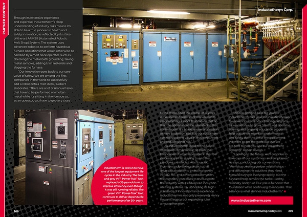 Through its extensive experience and expertise, Inductotherm’ s deep understanding of industy risks means it’ s able to be a true pioneer in health and safety innovation, as reflected by its stateof-the-art ARMS ®( Automated Robotic Melt Shop) System. The system uses advanced robotics to perform hazardous furnace operations that would otherwise be handled by a melt deck operator, such as checking the metal bath grounding, taking metal samples, adding trim materials and slagging the furnace.