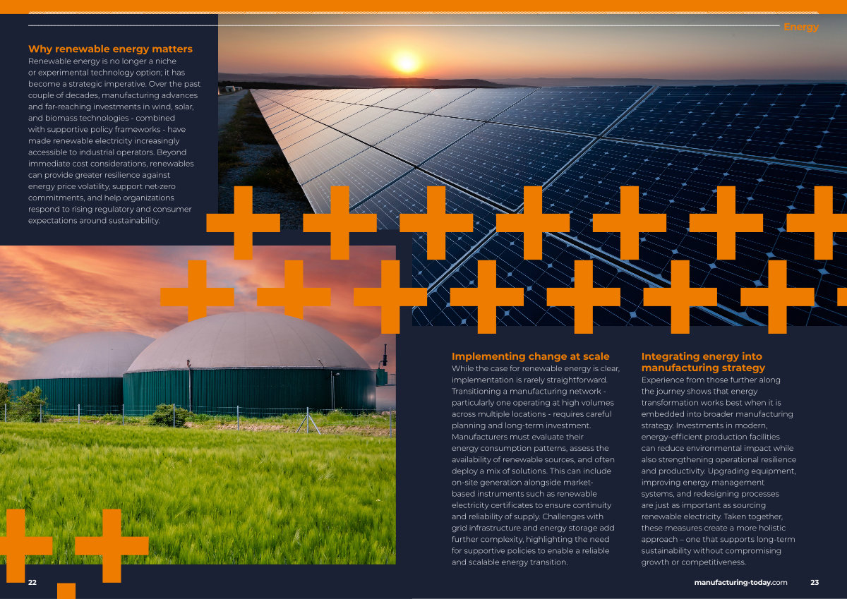 While the case for renewable energy is clear, implementation is rarely straightforward. Transitioning a manufacturing network- particularly one operating at high volumes across multiple locations- requires careful planning and long-term investment. Manufacturers must evaluate their energy consumption patterns, assess the availability of renewable sources, and often deploy a mix of solutions. This can include on-site generation alongside marketbased instruments such as renewable electricity certificates to ensure continuity and reliability of supply. Challenges with grid infrastructure and energy storage add further complexity, highlighting the need for supportive policies to enable a reliable and scalable energy transition.