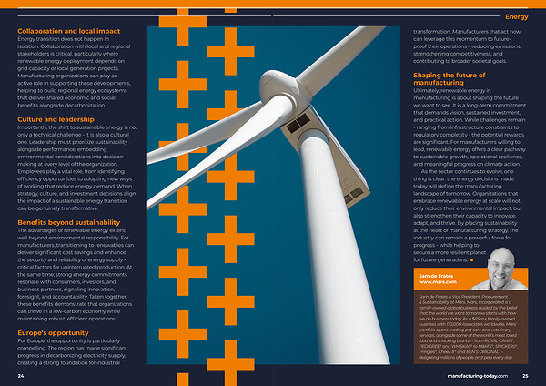 As the sector continues to evolve, one thing is clear: the energy decisions made today will define the manufacturing landscape of tomorrow. Organizations that embrace renewable energy at scale will not only reduce their environmental impact, but also strengthen their capacity to innovate, adapt, and thrive. By placing sustainability at the heart of manufacturing strategy, the industry can remain a powerful force for progress- while helping to secure a more resilient planet for future generations. ■