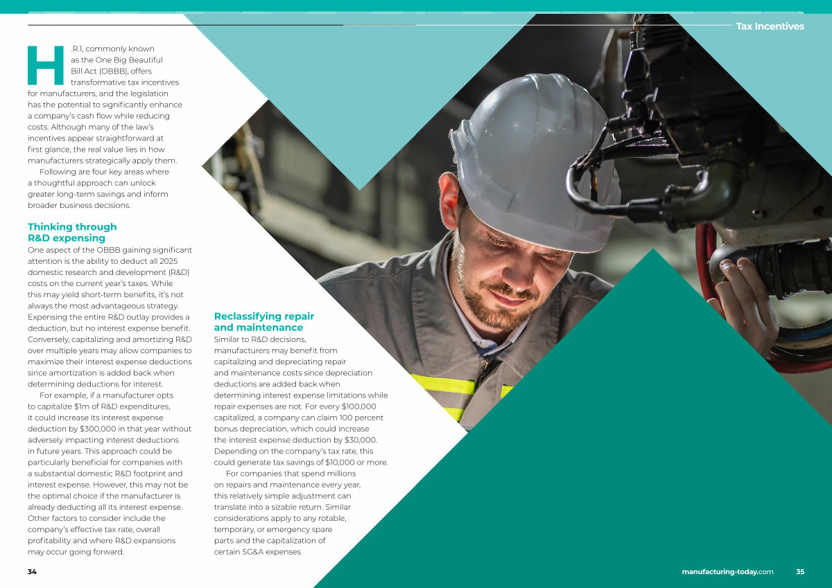 . R. 1, commonly known as the One Big Beautiful Bill Act( OBBB), offers transformative tax incentives for manufacturers, and the legislation has the potential to significantly enhance a company’ s cash flow while reducing costs. Although many of the law’ s incentives appear straightforward at first glance, the real value lies in how manufacturers strategically apply them.