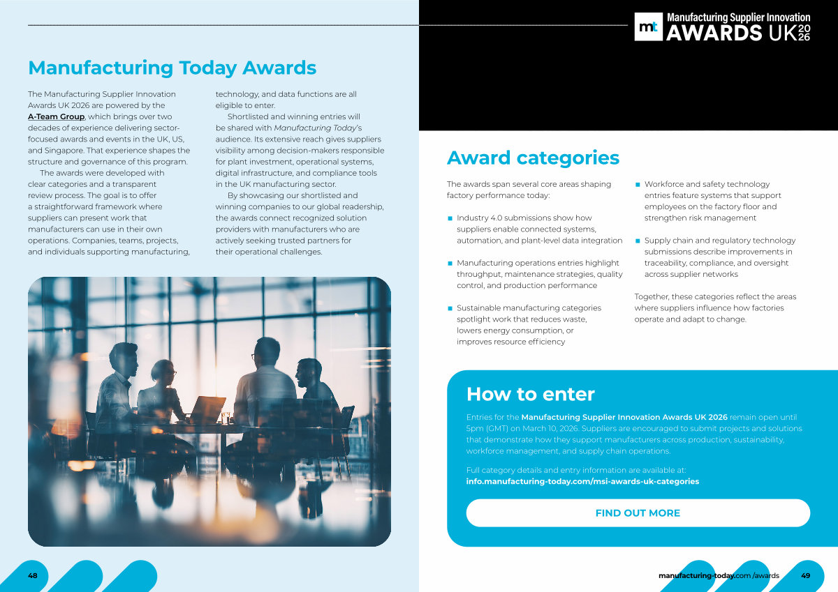Entries for the Manufacturing Supplier Innovation Awards UK 2026 remain open until 5pm( GMT) on March 10, 2026. Suppliers are encouraged to submit projects and solutions that demonstrate how they support manufacturers across production, sustainability, workforce management, and supply chain operations.