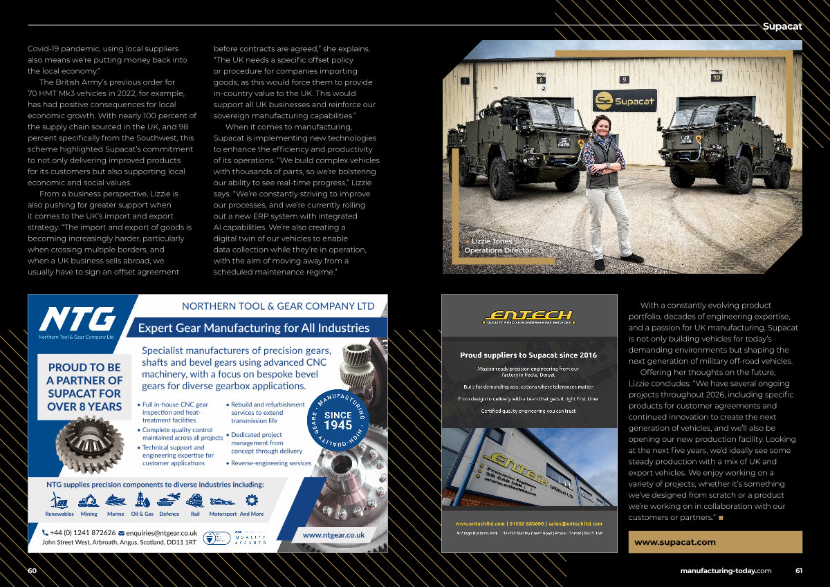 With a constantly evolving product portfolio, decades of engineering expertise, and a passion for UK manufacturing, Supacat is not only building vehicles for today’ s demanding environments but shaping the next generation of military off-road vehicles. Offering her thoughts on the future, Lizzie concludes:“ We have several ongoing projects throughout 2026, including specific products for customer agreements and continued innovation to create the next generation of vehicles, and we’ ll also be opening our new production facility. Looking at the next five years, we’ d ideally see some steady production with a mix of UK and export vehicles. We enjoy working on a variety of projects, whether it’ s something we’ ve designed from scratch or a product we’ re working on in collaboration with our customers or partners.” ■