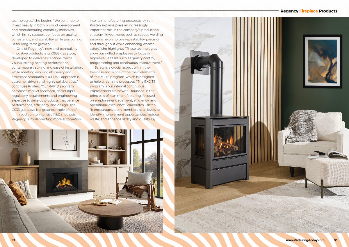 One of Regency’ s new and particularly innovative products is its GS33 gas stove, developed to deliver exceptional flame visuals, strong heating performance, contemporary styling and ease of installation, while meeting evolving efficiency and emissions standards.“ Our R & D approach is customer-driven and highly collaborative,” continues Kristen.“ Our RAPID program combines market feedback, dealer input, regulatory requirements and engineering expertise to develop products that balance performance, efficiency, and design. The GS33 gas stove is a great example of that.”
