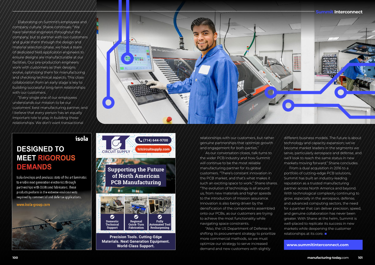 From a dual acquisition in 2016 to a portfolio of cutting-edge PCB solutions, Summit has built an industry-leading reputation as a trusted manufacturing partner across North America and beyond. With technological complexity continuing to grow, especially in the aerospace, defense, and advanced computing sectors, the need for a partner that can deliver precision, speed, and genuine collaboration has never been greater. With Shane at the helm, Summit is well-placed to replicate its success in new markets while deepening the customer relationships at its core. ■