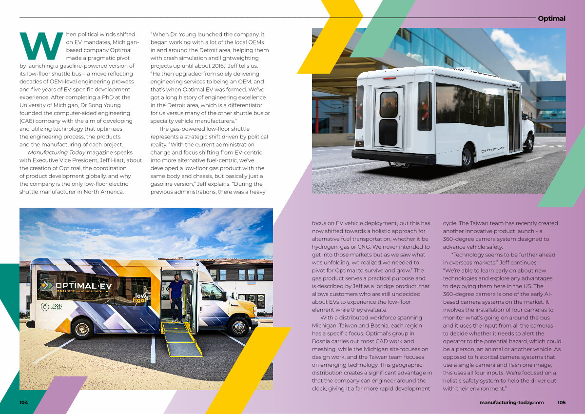 Manufacturing Today magazine speaks with Executive Vice President, Jeff Hiatt, about the creation of Optimal, the coordination of product development globally, and why the company is the only low-floor electric shuttle manufacturer in North America.
