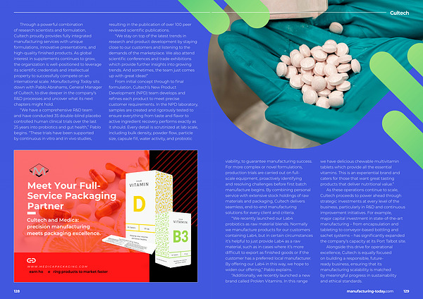 As these operations continue to scale, Cultech proceeds to power ahead through strategic investments at every level of the business, particularly in R & D and continuous improvement initiatives. For example, major capital investment in state-of-the-art manufacturing – from encapsulation and tableting to conveyor-based bottling and sachet systems – has significantly expanded the company’ s capacity at its Port Talbot site.