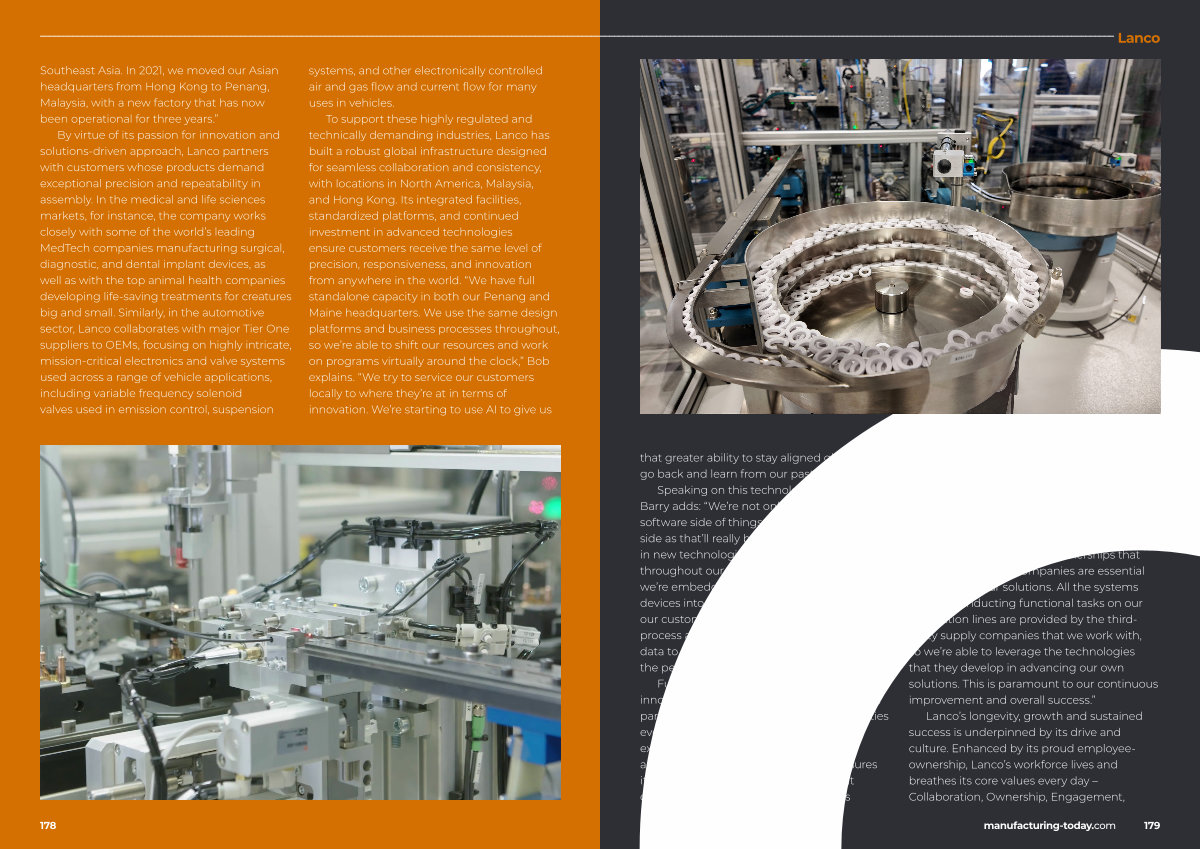 Speaking on this technological integration, Barry adds:“ We’ re not only looking at the software side of things, but also the hardware side as that’ ll really be the gateway to bringing in new technologies and deploying them throughout our applications. For instance, we’ re embedding a lot of intelligent and smart devices into our production lines, which gives our customers full visibility into the production process and allows them to collect real-time data to monitor and analyze any reductions in the performance or efficiency they can do.” Further augmenting this continued innovation is a strong ecosystem of strategic partnerships that expands Lanco’ s capabilities even further. By aligning its in-house expertise with best-in-class automation and control providers, the company ensures it is continuously enhancing the value it delivers to customers.“ We are systems integrators, so we continue to leverage and rely on the strong partnerships that we’ ve established over the last 35 years. We work with some of the largest, most well-known companies, including FANUC, Stäubli, Siemens, Rockwell Automation, Keyence, and Cognex,” Barry says.“ The partnerships that we hold with these companies are essential in advancing our solutions. All the systems that are conducting functional tasks on our production lines are provided by the thirdparty supply companies that we work with, so we’ re able to leverage the technologies that they develop in advancing our own solutions. This is paramount to our continuous improvement and overall success.”