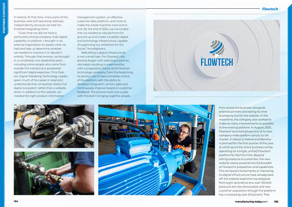 from across the business alongside external partners and taking its time to properly launch the website. In the meantime, the company also worked to make as many improvements as possible to the existing platform. In August 2025, Flowtech launched phase one of its new company-wide platform across its UK market. A rollout to Ireland and Benelux is planned for the first quarter of this year, at which point the entire business will be operating on a single, unified Flowtech platform for the first time. Beyond selling products to customers, the new website clearly presents the full breadth of Flowtech’ s proposition and capabilities. The company’ s investments in improving its digital infrastructure have already paid off: the website load time has dropped from eight seconds to one, over 120,000 products are now showcased, and new customer acquisition through the platform has increased by over 90 percent. That