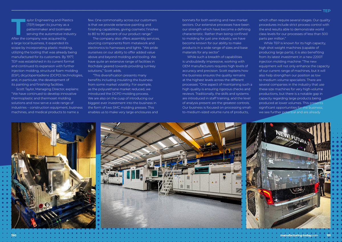 While TEP is known for its high capacity, high shot weight machines( capable of producing large parts), it is also benefiting from its latest investment in a new 2200T injection molding machine:“ The new equipment will not only enhance the capacity of our current range of machines, but it will also help strengthen our position as low to medium volume specialists. There are several companies in the industry that use these size machines for very high-volume productions, but there is a notable gap in capacity regarding large products being produced at lower volumes. This presents significant opportunities for the business; we see further potential and are already