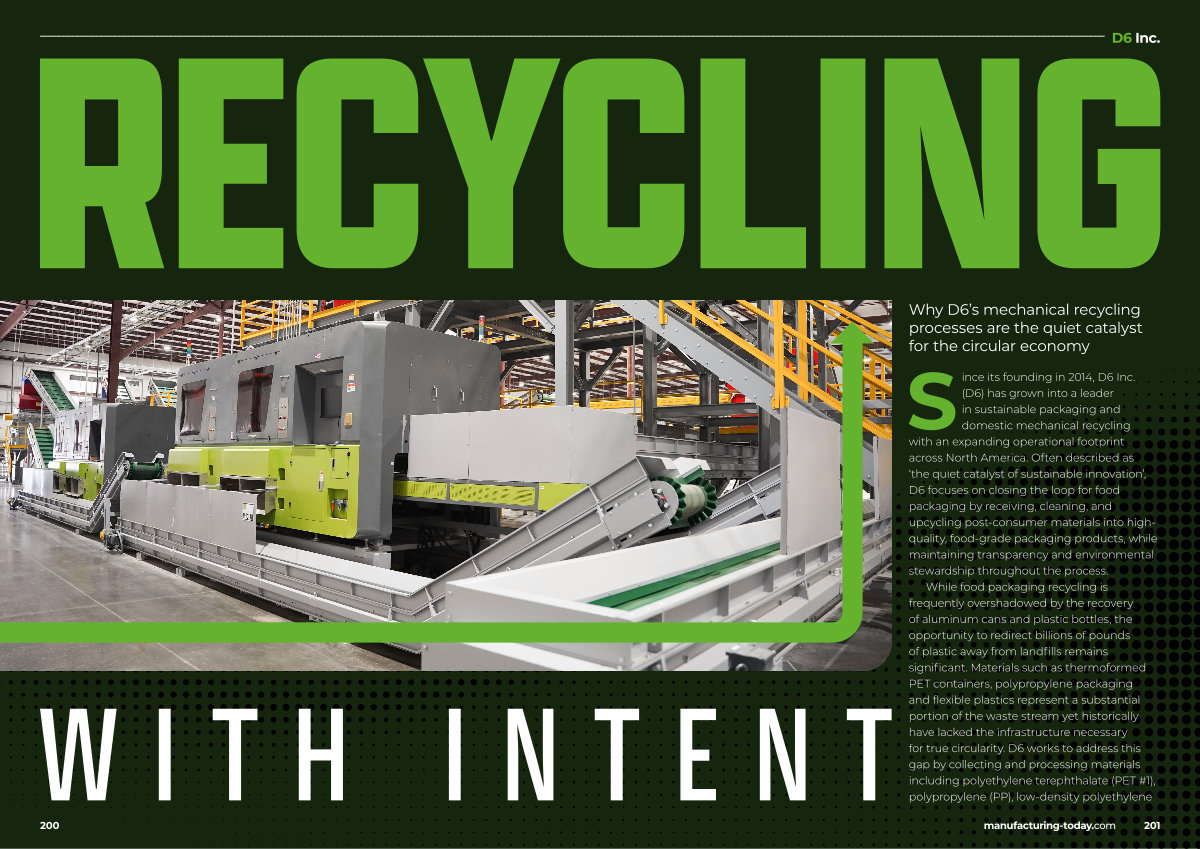Since its founding in 2014, D6 Inc.( D6) has grown into a leader in sustainable packaging and domestic mechanical recycling with an expanding operational footprint across North America. Often described as‘ the quiet catalyst of sustainable innovation’, D6 focuses on closing the loop for food packaging by receiving, cleaning, and upcycling post-consumer materials into highquality, food-grade packaging products, while maintaining transparency and environmental stewardship throughout the process.
