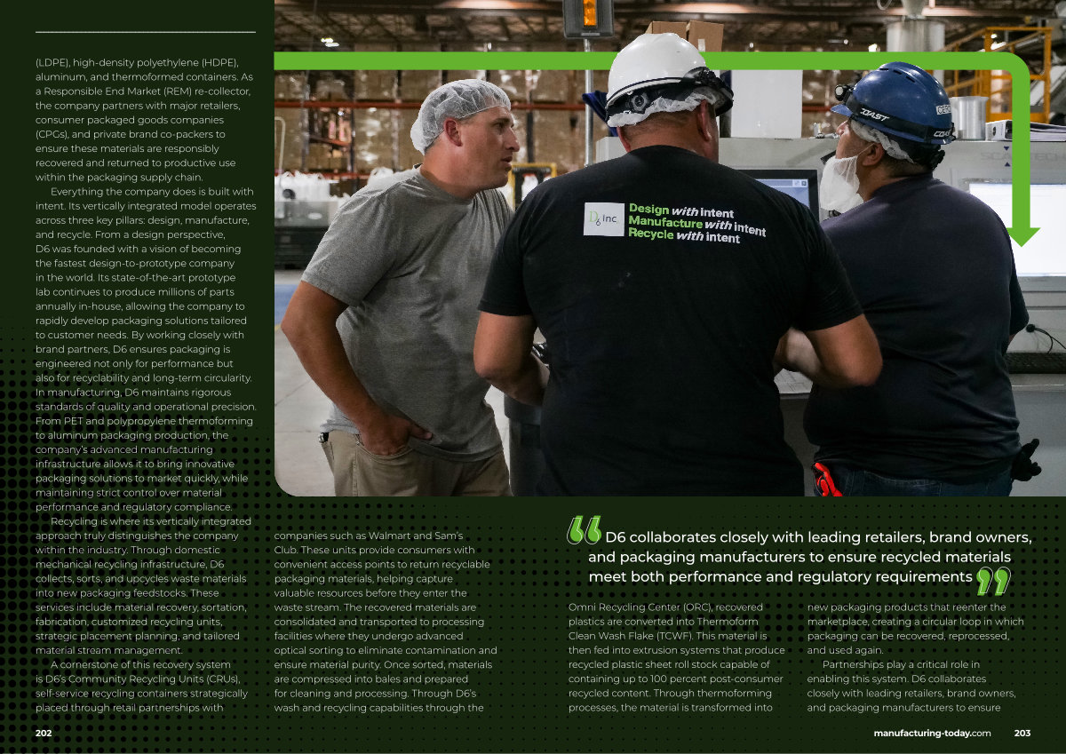 Everything the company does is built with intent. Its vertically integrated model operates across three key pillars: design, manufacture, and recycle. From a design perspective, D6 was founded with a vision of becoming the fastest design-to-prototype company in the world. Its state-of-the-art prototype lab continues to produce millions of parts annually in-house, allowing the company to rapidly develop packaging solutions tailored to customer needs. By working closely with brand partners, D6 ensures packaging is engineered not only for performance but also for recyclability and long-term circularity. In manufacturing, D6 maintains rigorous standards of quality and operational precision. From PET and polypropylene thermoforming to aluminum packaging production, the company’ s advanced manufacturing infrastructure allows it to bring innovative packaging solutions to market quickly, while maintaining strict control over material performance and regulatory compliance.