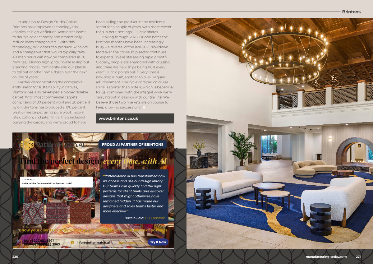 In addition to Design Studio Online, Brintons has employed technology that enables its high-definition Axminster looms to double color capacity and dramatically reduce loom changeovers.“ With this technology, our looms can produce 32 colors, and a changeover that would typically take 40 man hours can now be completed in 30 minutes,” Duccio highlights.“ We’ re rolling out a second model imminently and our plan is to roll out another half a dozen over the next couple of years.”