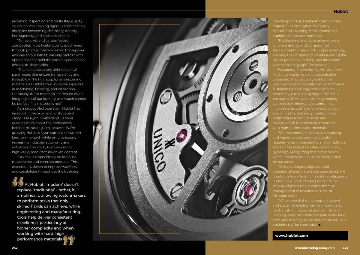 At Hublot,‘ modern’ doesn’ t replace‘ traditional’- rather, it amplifies it, allowing watchmakers to perform tasks that only skilled hands can achieve, while engineering and manufacturing tools help deliver consistent excellence, particularly at higher complexity and when working with hard, highperformance materials