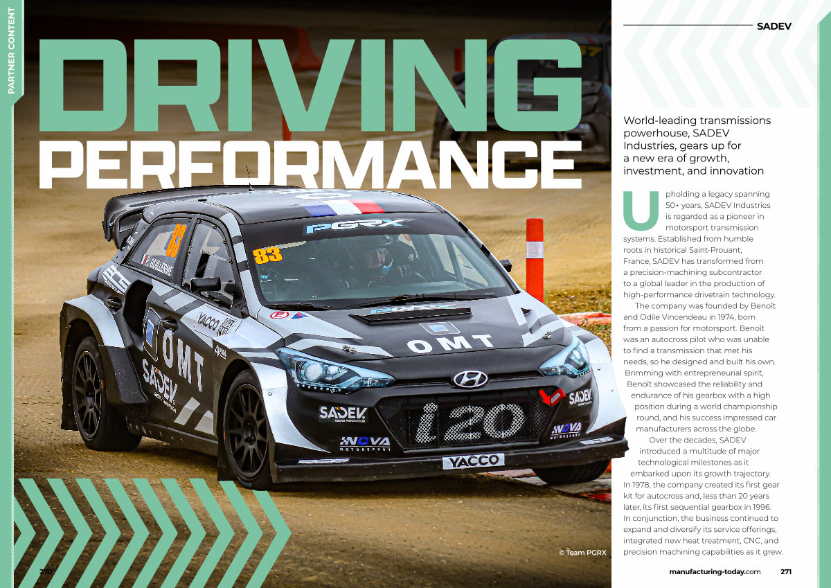 The company was founded by Benoît and Odile Vincendeau in 1974, born from a passion for motorsport. Benoît was an autocross pilot who was unable to find a transmission that met his needs, so he designed and built his own. Brimming with entrepreneurial spirit, Benoît showcased the reliability and endurance of his gearbox with a high position during a world championship round, and his success impressed car manufacturers across the globe. Over the decades, SADEV introduced a multitude of major technological milestones as it embarked upon its growth trajectory. In 1978, the company created its first gear kit for autocross and, less than 20 years later, its first sequential gearbox in 1996. In conjunction, the business continued to expand and diversify its service offerings, integrated new heat treatment, CNC, and precision machining capabilities as it grew.