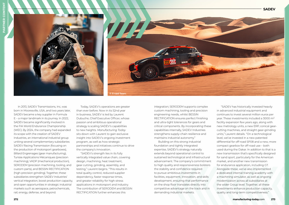 In 2013, SADEV Transmissions, Inc, was born in Mooresville, USA, and two years later, SADEV became a key supplier in Formula E – a major landmark in its journey. In 2022, SADEV became significantly involved in the FIA World Endurance Championship( WEC). By 2024, the company had expanded its scope with the creation of SADEV Industries, an international industrial group uniting several complementary subsidiaries: SADEV Racing Transmission( focusing on the production of motorsport gearboxes), Billard Engrenages( gear manufacturing), Tunisie Applications Mécaniques( precision machining), VADP( mechanical production), SERODEM( precision machining, tooling, and custom parts), and BESSIN RECTIFICATION( high‐precision grinding). Together, these subsidiaries strengthen SADEV Industries’ vertical integration, boost production capacity, and open opportunities in strategic industrial markets such as aerospace, petrochemicals, rail, energy, defense, and beyond.