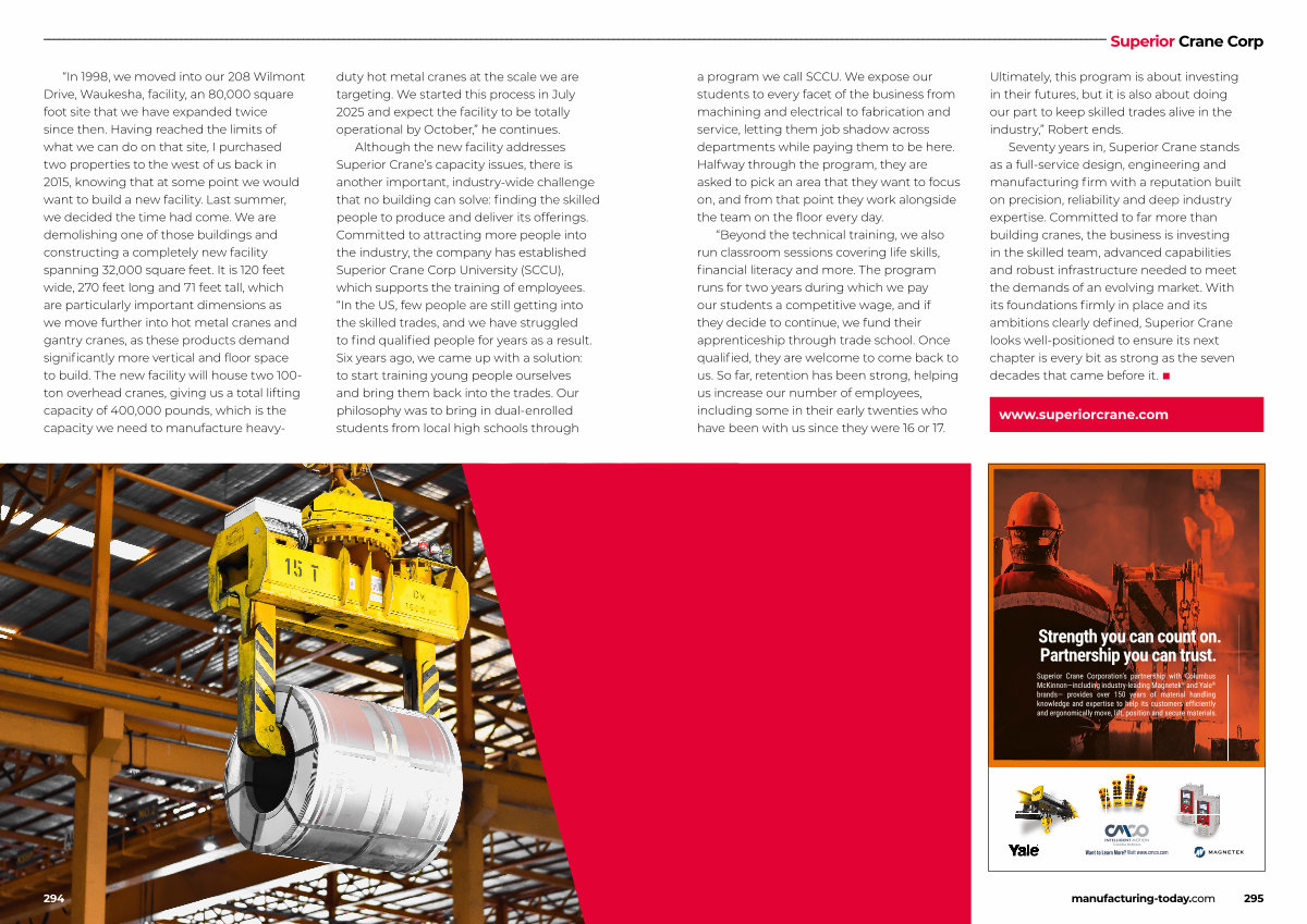 Superior Crane Corporation’ s partnership with Columbus McKinnon— including industry-leading Magnetek ® and Yale ® brands— provides over 150 years of material handling knowledge and expertise to help its customers efficiently and ergonomically move, lift, position and secure materials.