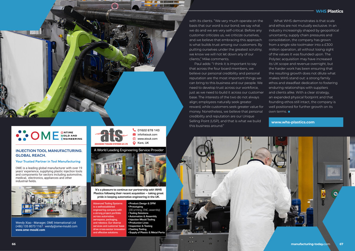 What WHS demonstrates is that scale and ethos are not mutually exclusive. In an industry increasingly shaped by geopolitical uncertainty, supply chain pressures and consolidation, the company has grown from a single-site toolmaker into a £ 300 million operation, all without losing sight of the values it was founded upon. The Polytec acquisition may have increased its UK scope and revenue overnight, but the harder work has been ensuring that the resulting growth does not dilute what makes WHS stand out: a strong family ethos and steadfast dedication to fostering enduring relationships with suppliers and clients alike. With a clear strategy, an expanded physical footprint and that founding ethos still intact, the company is well positioned for further growth on its own terms. ■