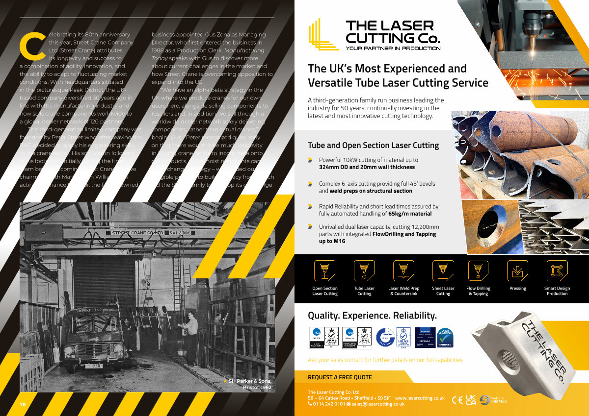 Celebrating its 80th anniversary this year, Street Crane Company Ltd( Street Crane) attributes its longevity and success to a combination of agility, innovation, and the ability to adapt to fluctuating market conditions. With headquarters situated in the picturesque Peak District, the UKbased company diversified 30 years ago in line with the manufacturing industry and now sells crane components worldwide to a global dealer network of 120 partners.