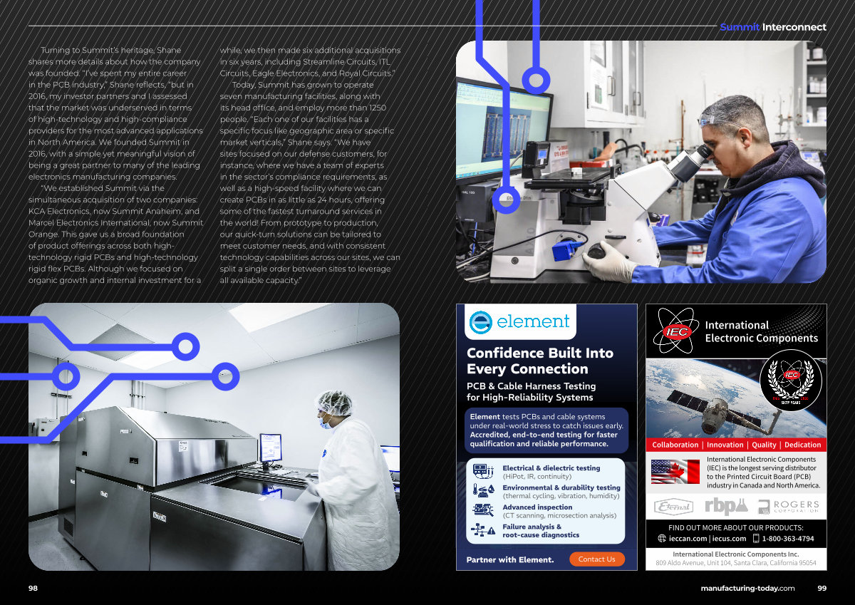 “ We established Summit via the simultaneous acquisition of two companies: KCA Electronics, now Summit Anaheim, and Marcel Electronics International, now Summit Orange. This gave us a broad foundation of product offerings across both hightechnology rigid PCBs and high-technology rigid flex PCBs. Although we focused on organic growth and internal investment for a while, we then made six additional acquisitions in six years, including Streamline Circuits, ITL Circuits, Eagle Electronics, and Royal Circuits.”