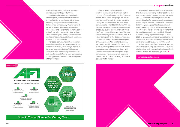 For 2026, Compass’ priorities center on capacity expansion.“ As we evaluate all our customer markets, we identify where our targeted focus needs to be,” Bill reveals.“ This year, we’ ll be focusing on more fiveaxis machining platforms, plus we’ re seeing a strong push in the Swiss machining side of the business.”